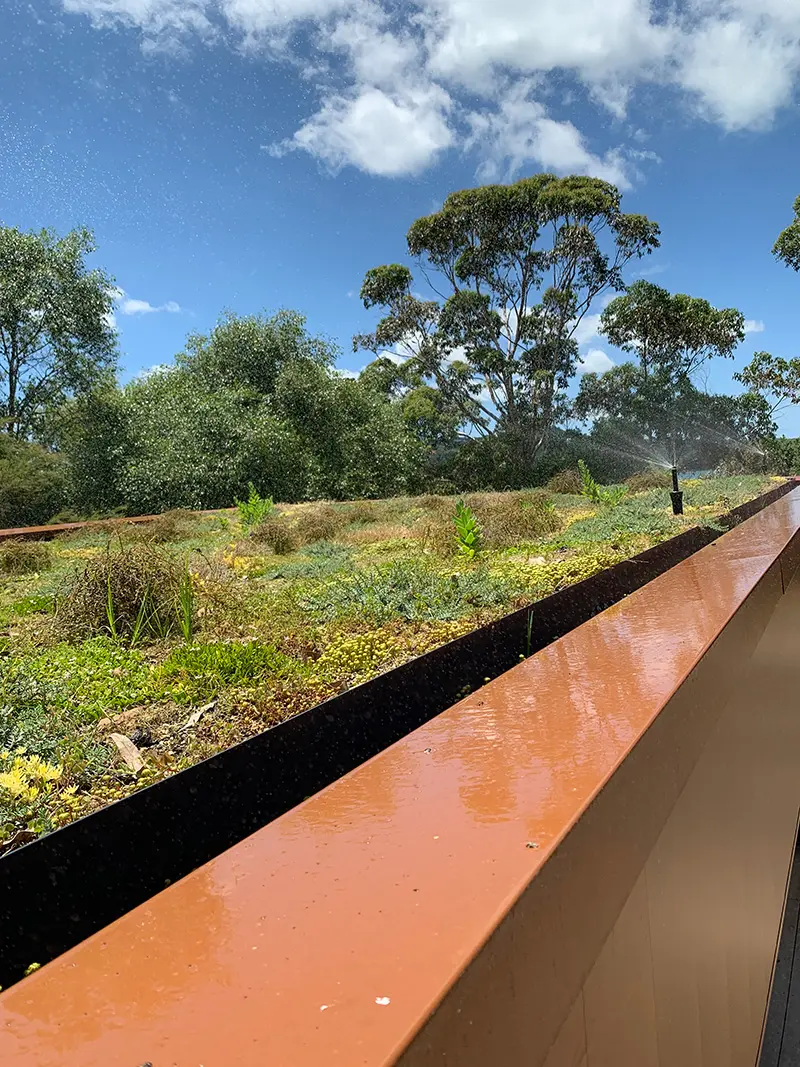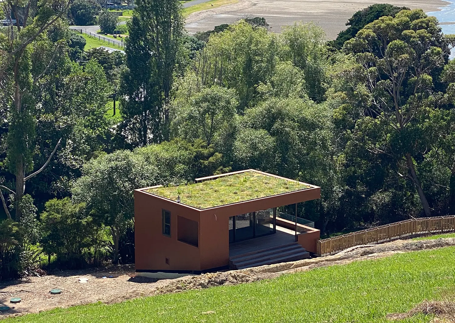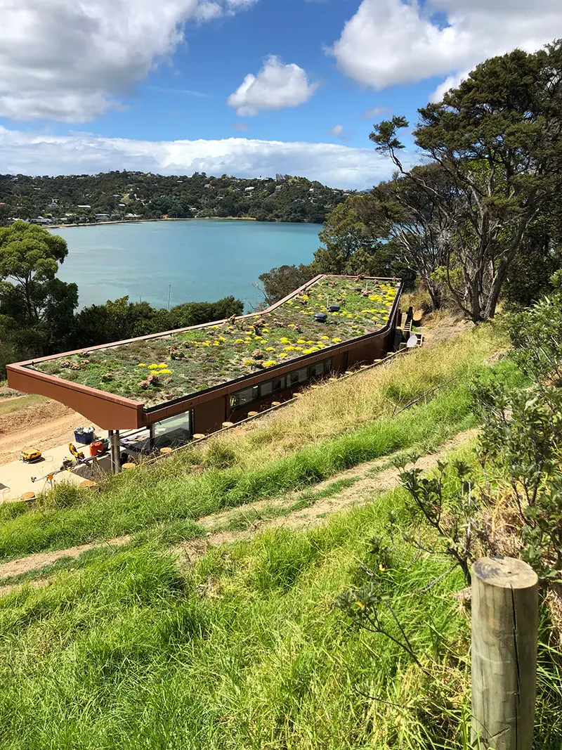Greenroofs was commissioned by Biggs Construction to supply and install a green roof on a new house (160m²) at Church Bay Road (overlooking Blackpool beach) on Waiheke Island. The architects were Bossley Architects. The roof waterproofing was a torch-on membrane by Nuralite. These photos were taken approximately 8 weeks after installation and 12 months after installation respectively.