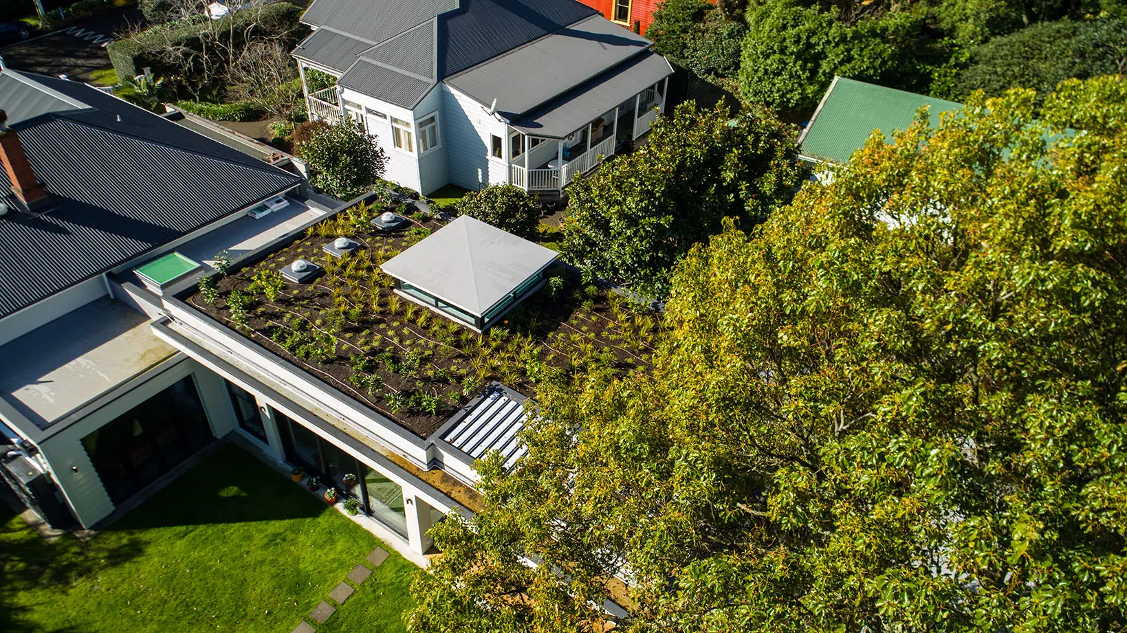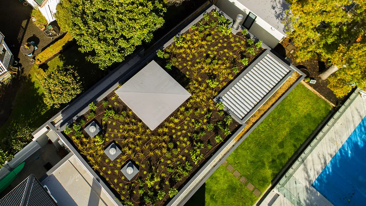 Concrete roof and weight was no issue so growing media up to 450mm depth to enable well established large native and exotic plant species. Extra root barrier was installed so that the wpm could be warranted up to 40 years. 40m³ of specially formulated growing media was pumped/blown in.