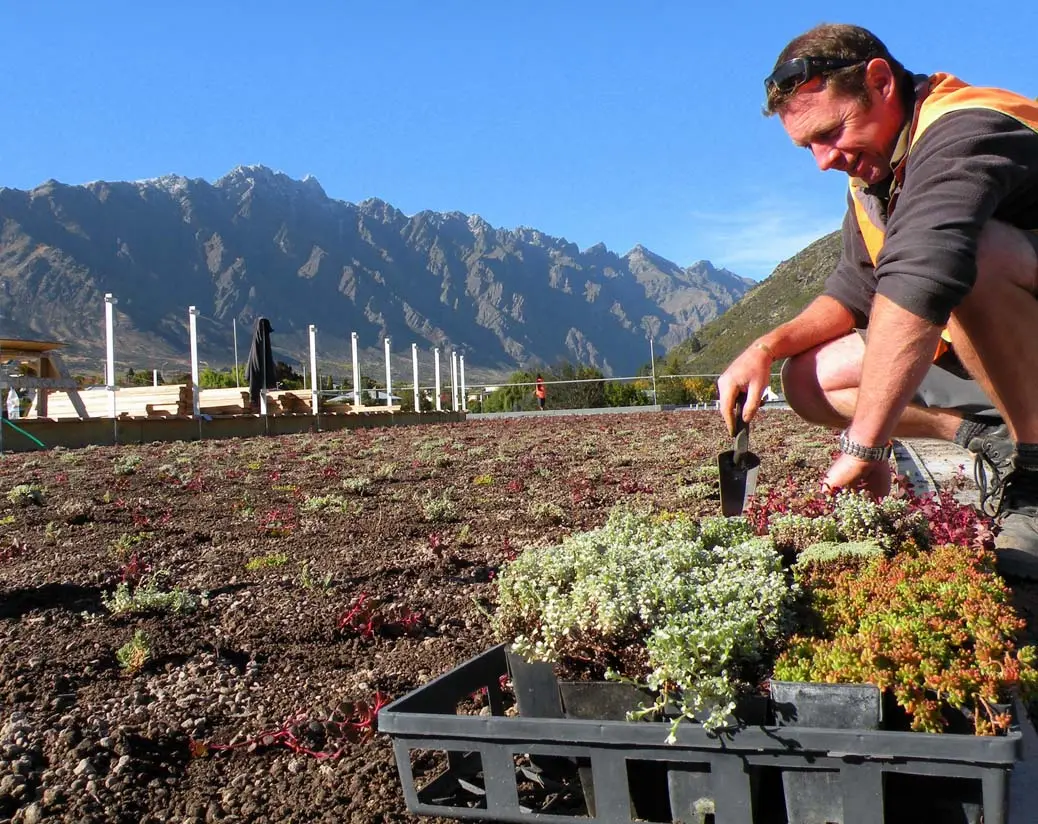 This green roof was installed in two phases, Phase 1 in April 2010 and the remaining planting was installed in November 2010 to miss the frosty season. The total green roof area is 825m2 and is situated alongside a boardwalk that runs over the school roof, which is used as an entryway to the school. The plan is to use the area as an outdoor classroom. The green roof is made up of a wide variety of sedum and succulent plants manually planted into the growing medium. The plants, which will turn into different colours throughout the year, were chosen for their hardiness so they would be able to survive the cold Queenstown winters.