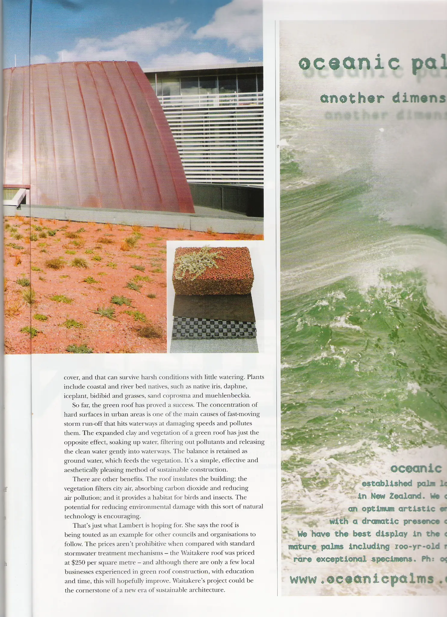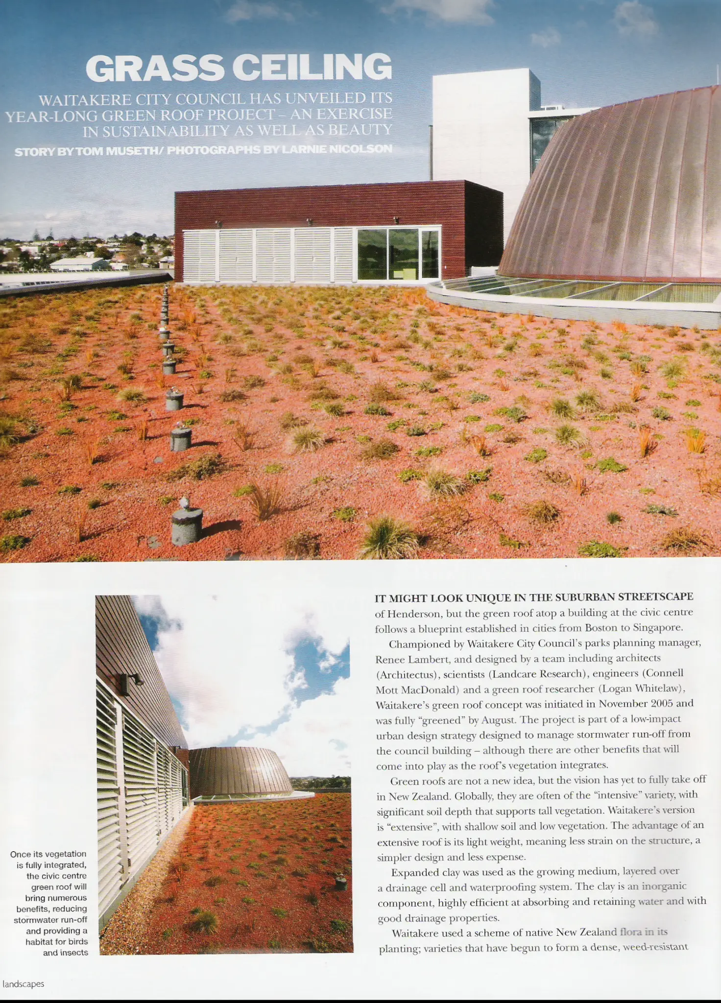 A modern, award-winning green roof, The Waitakere Civic Centre greenroof was installed in June 2006. The roof was designed to manage stormwater runoff as well as to encourage biodiversity It has recently won the Award of Excellence for Sustainability. It is believed to be the first green roof on a civic building in New Zealand, as well as the most extensive native roof.